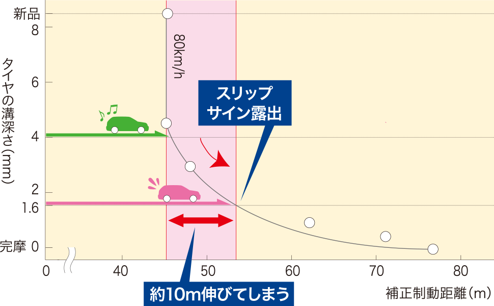 時速80kmで走行し、濡れた路面でブレーキングをした場合、残り溝が約4mmから制動距離が伸び始めます。