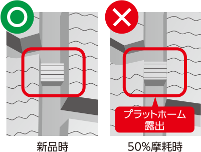 溝の深さ50%の位置にある「プラットホーム」が露出したら、早めに交換してください