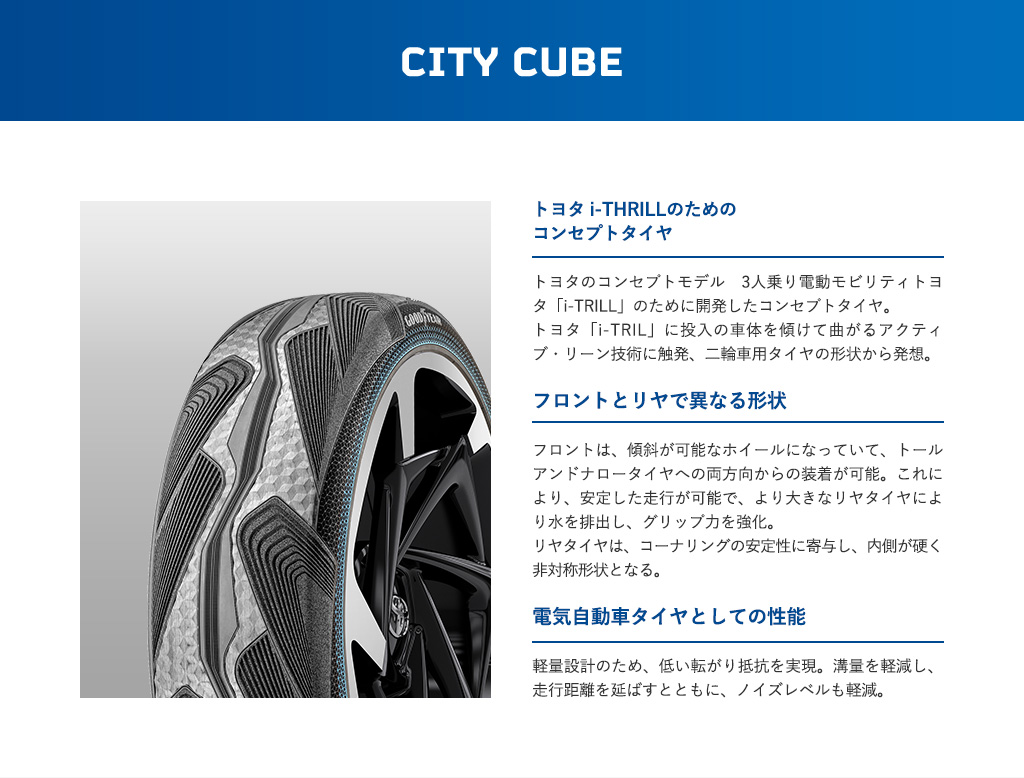 トヨタのコンセプトモデル 3人乗り電動モビリティトヨタ「i-TRILL」のために開発したコンセプトタイヤ。