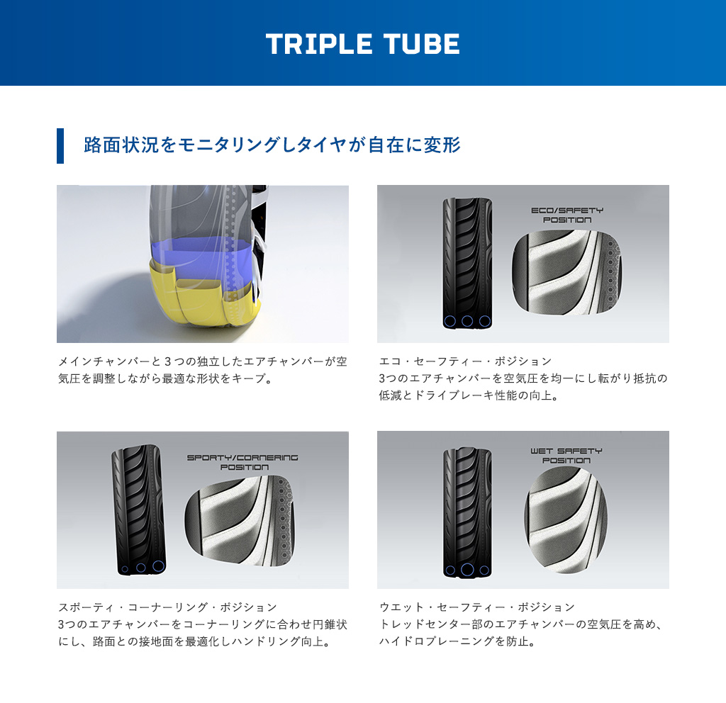 トレッドセンター部のエアチャンバーの空気圧を高め、ハイドロプレーニングを防止。